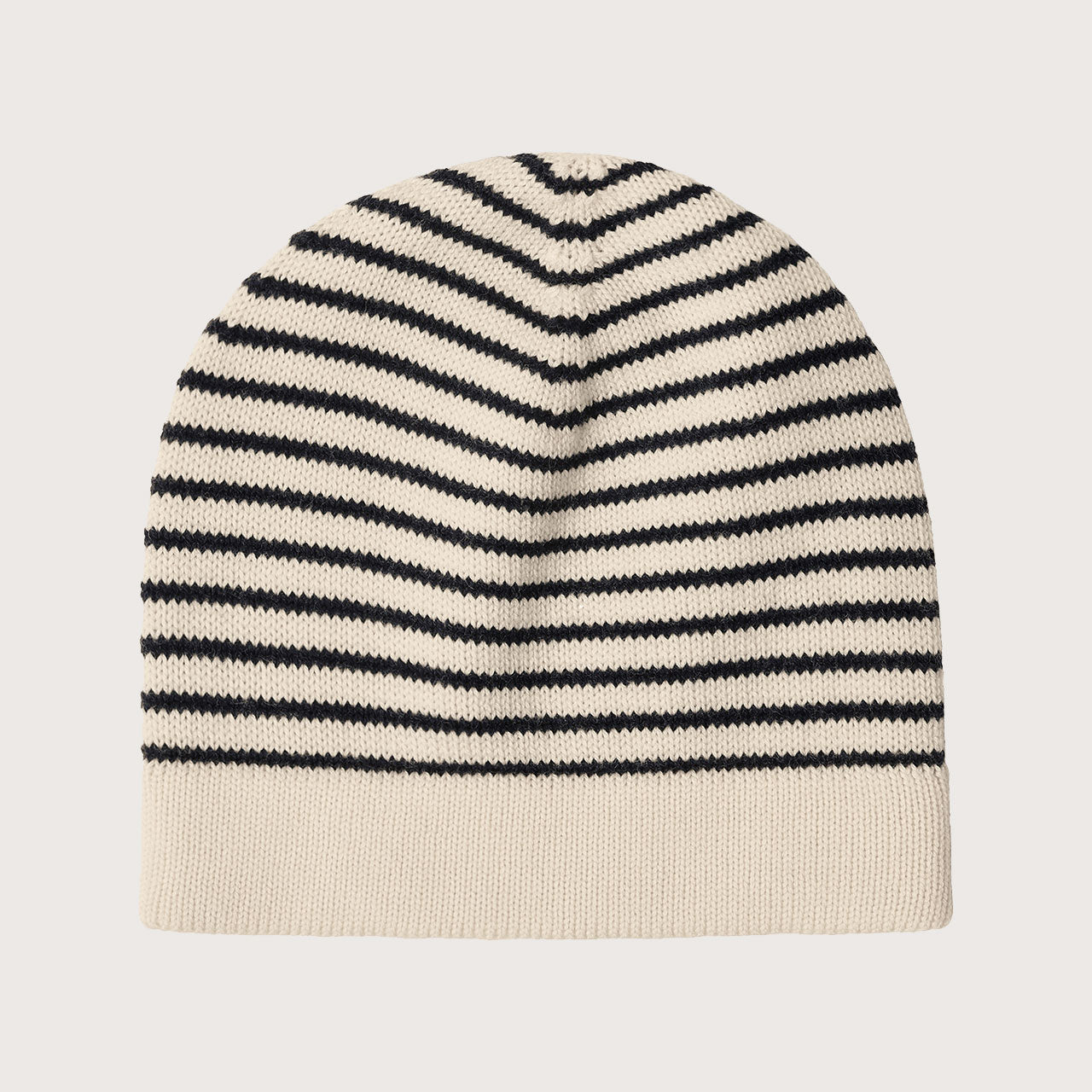 Cosy knit rib beanie for child and adult in the softest merino wool. This winter hat features a classic navy/ecru stripe.