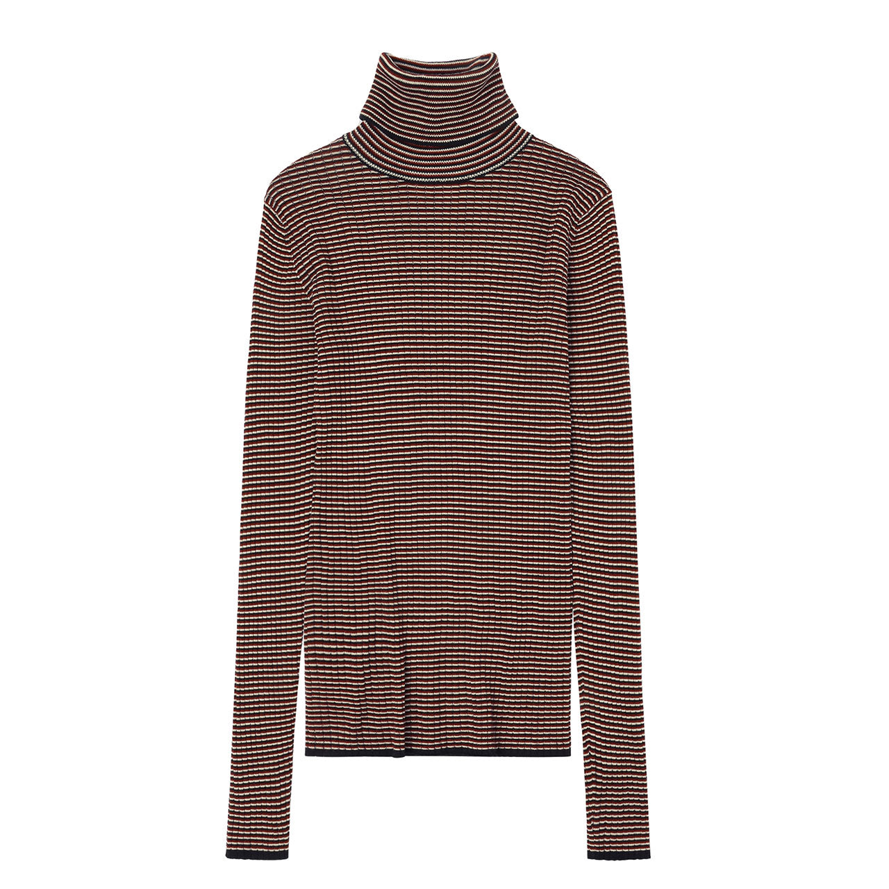 This beautiful rib knit with a high rollneck blouse is easy to wear everyday. A lightweight but warm top, great for layering. Knitted in a classic striped rib, this long-sleeved top has a straight slim fit and is detailed with rollneck and clean selvedge at bottom and sleeve hemline. Exquisitely made 100% superfine Merino wool fully fashioned knitwear for Women.