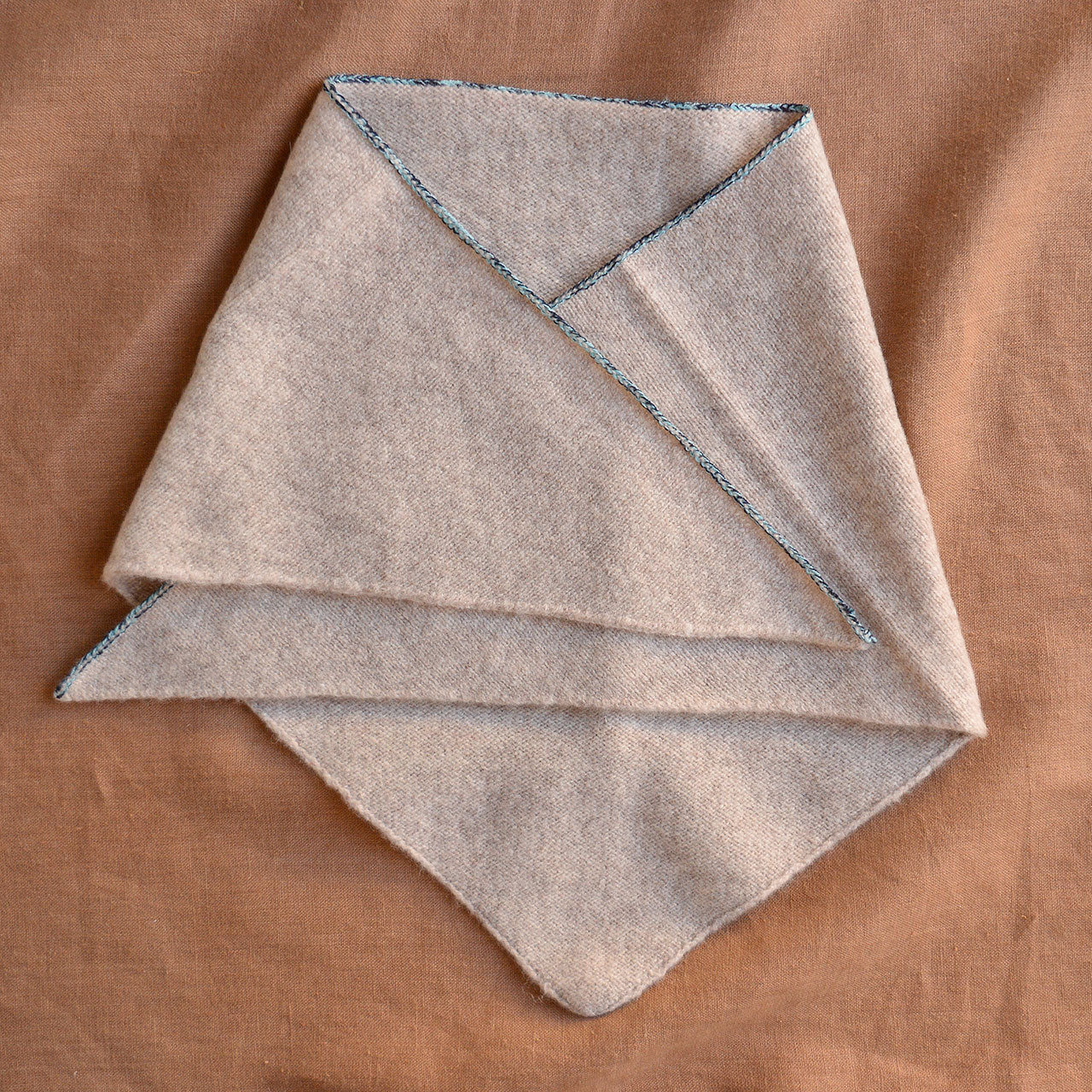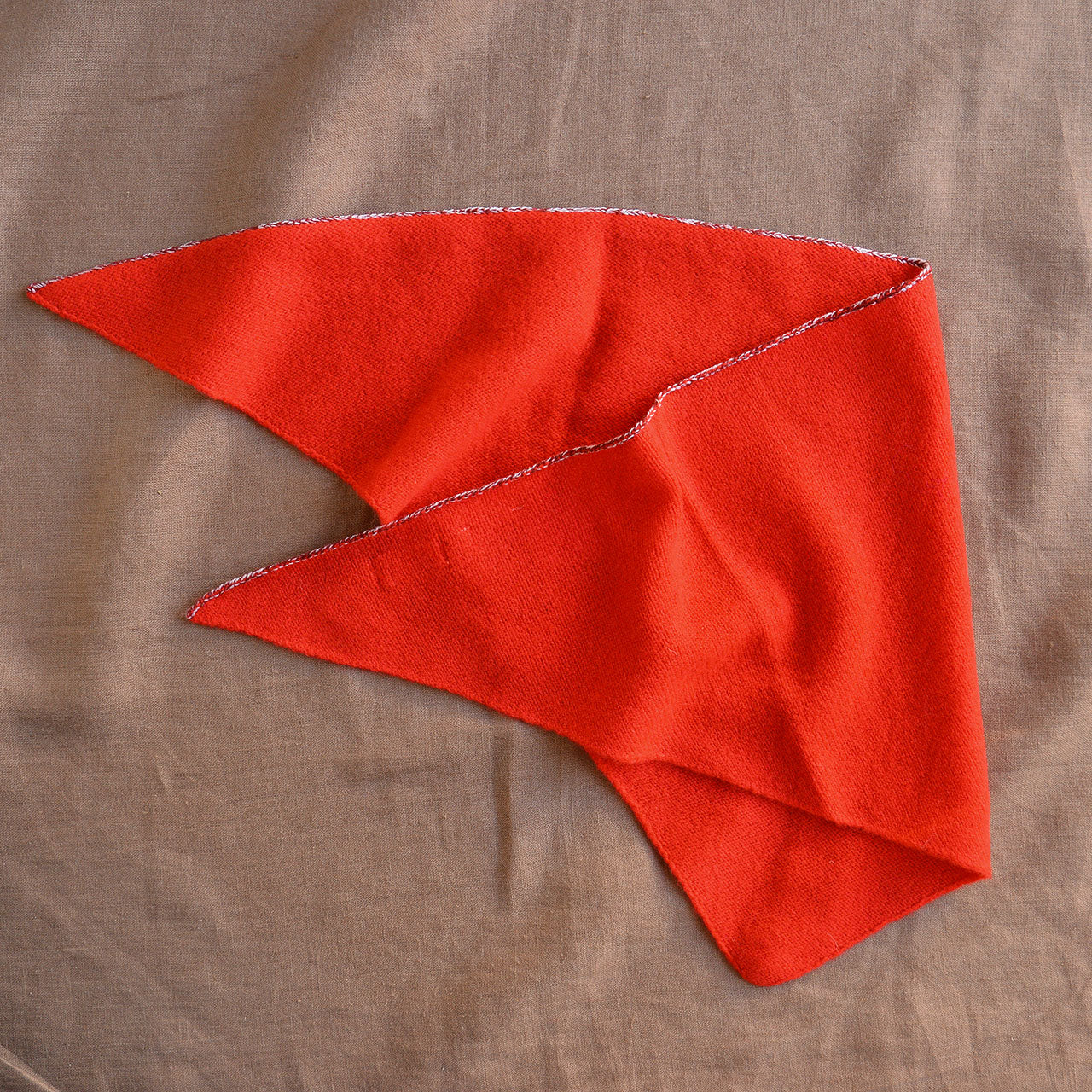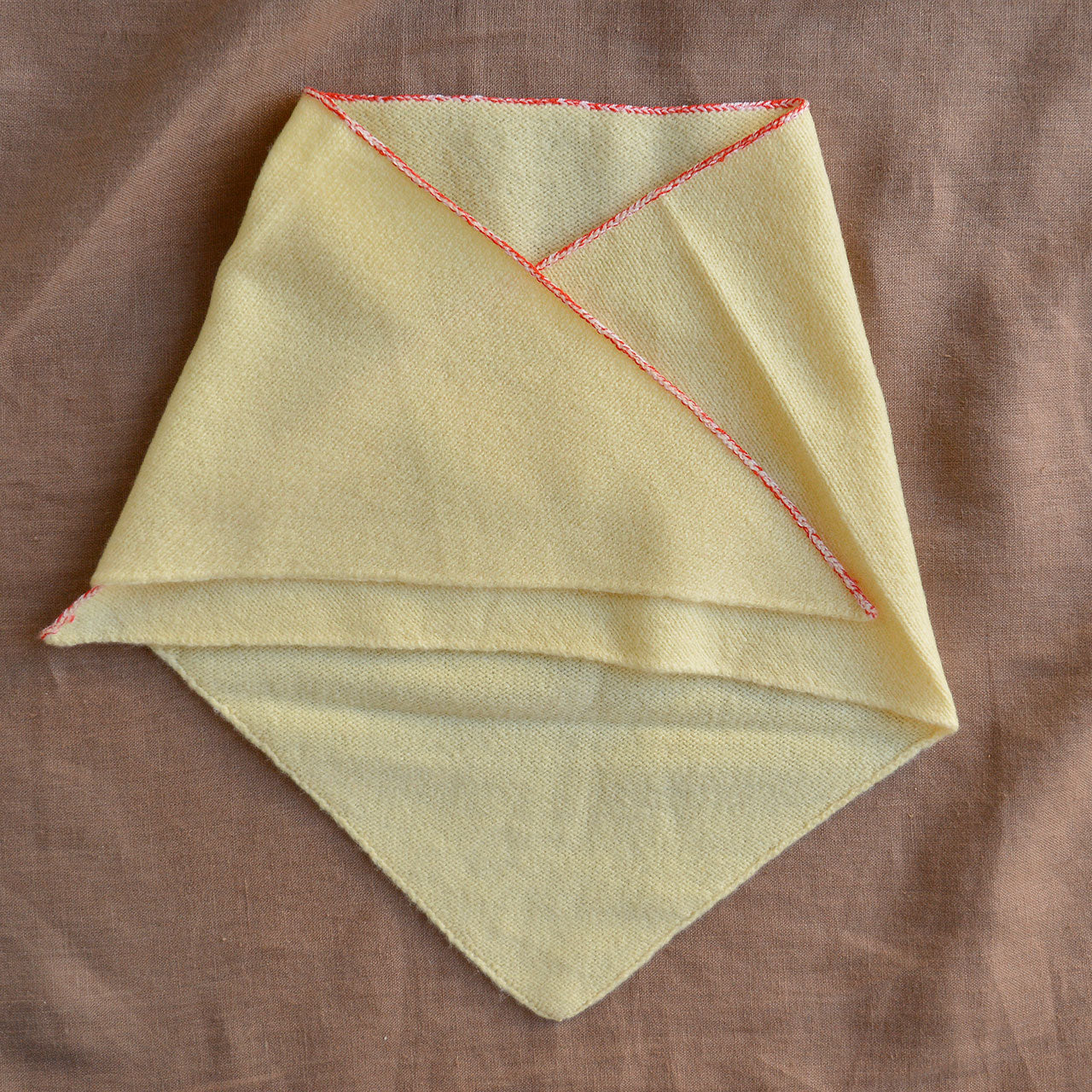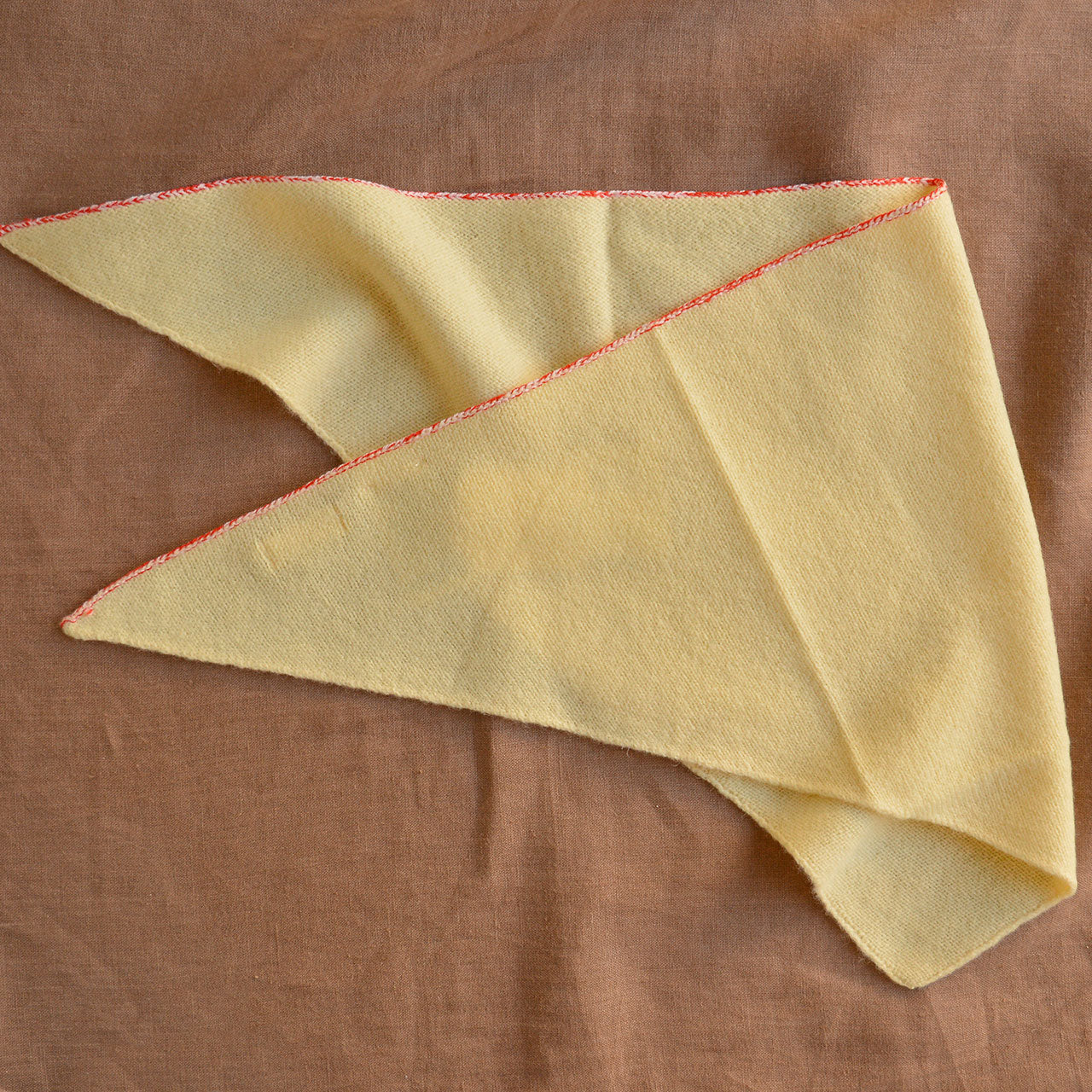 A gorgeous and versatile bandana scarf. This triangle-shaped bandana is knitted in a single jersey and features ribbing with a subtle melange edge detail in contrasting colour on one side. Made from classic, slightly fuzzy lambswool.