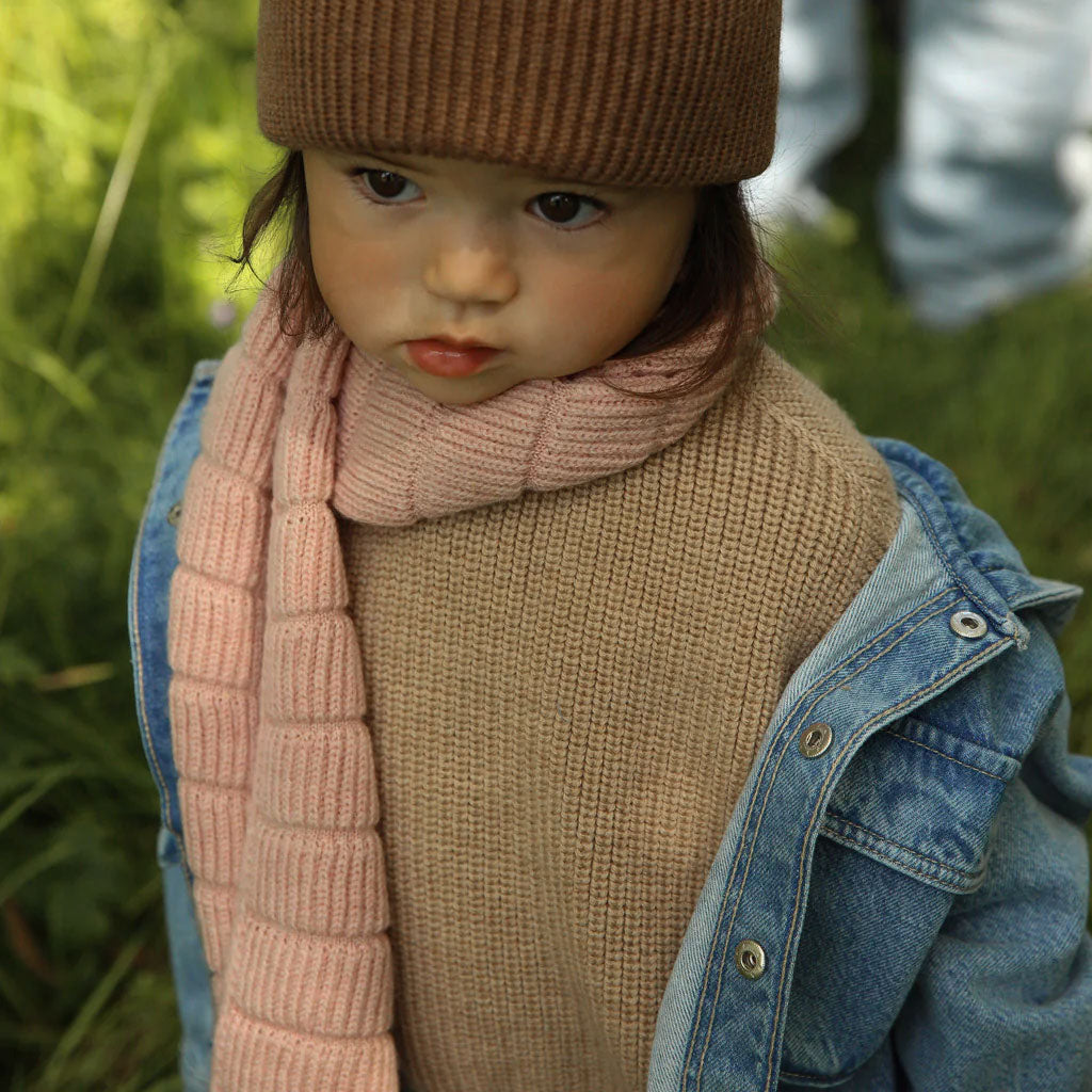 Gorgeous scarf in 100% extra fine Italian Merino wool by Belgian brand Hvid. So soft and warm! In a beautiful rib knit, this soft neck warmer scarf makes it easy for little ones to stay cosy. A generous length for little ones, allowing it to be wrapped, knotted, or draped with ease. Long enough to make a sweet neckwarmer for adults too!