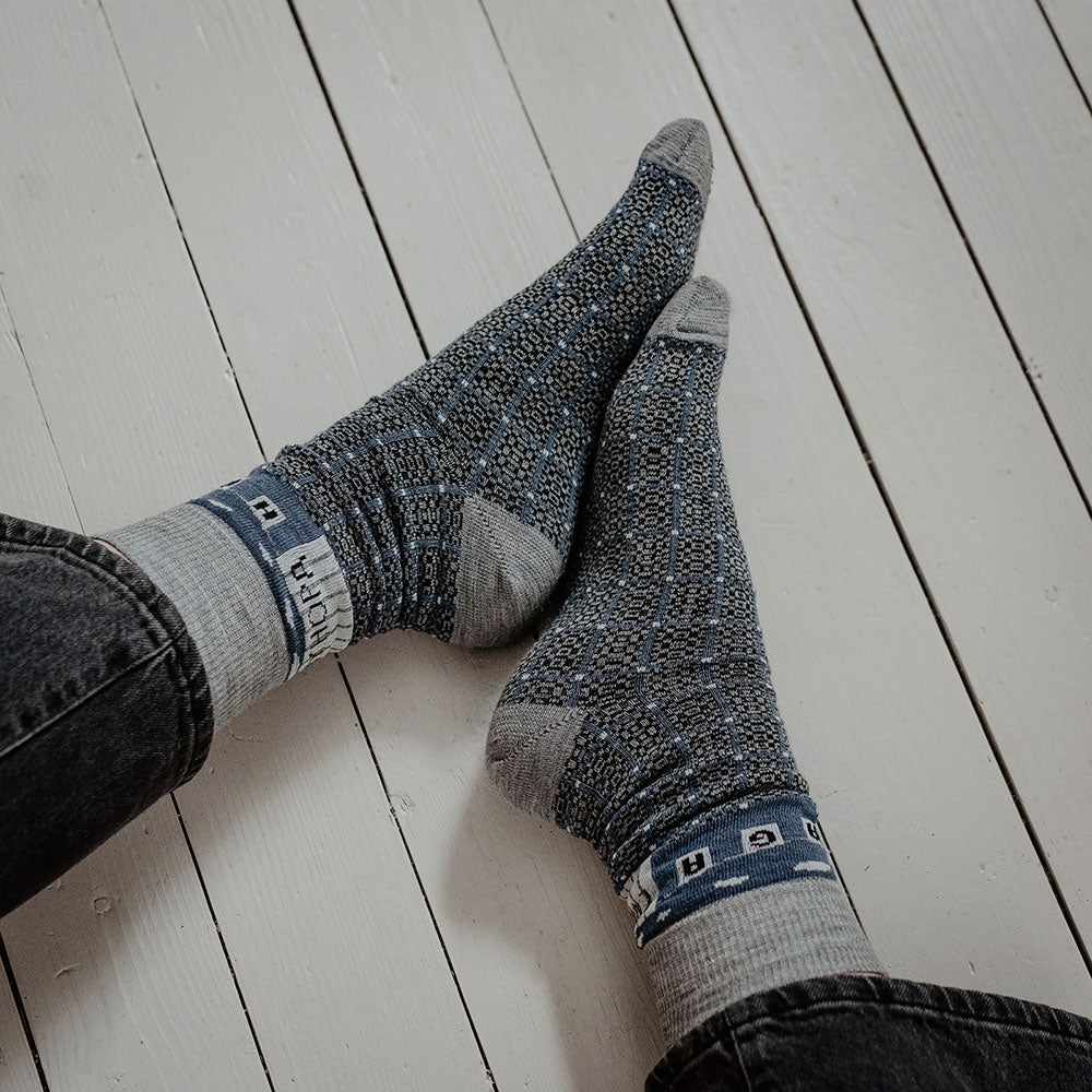 Because jacquard socks have floats on the inside, we recommend you put your socks on like your mum used to do for you when you were a child. Bunch them up to the toe, put your foot in place and then unravel the rest of the sock up your leg. Don’t try to just shove your whole foot in from the cuff as your toes might catch some of the floats!!
