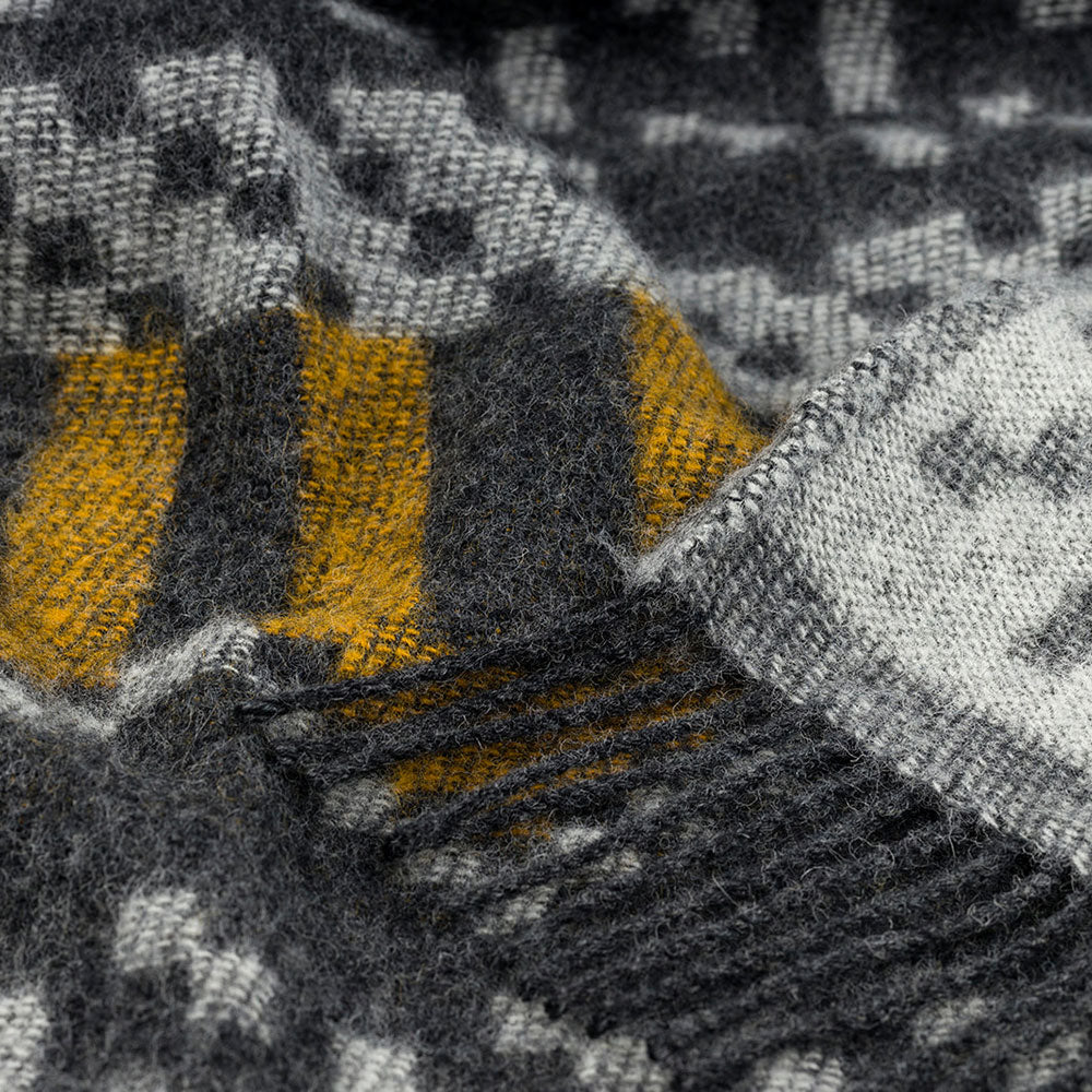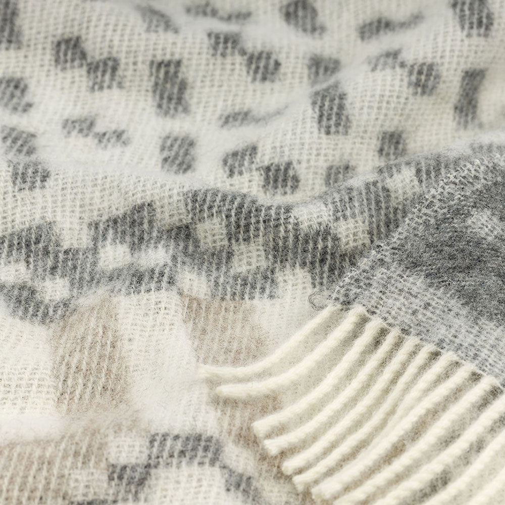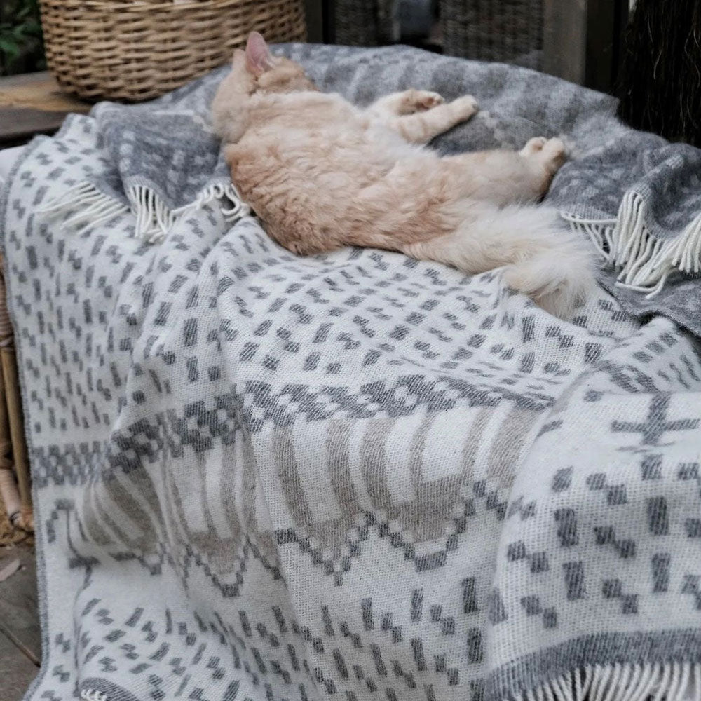 Woven on jacquard looms, the pattern appears clearly on both sides, with the reverse forming a mirror image of the front. Excluding the fringes, the blanket measures almost exactly two metres in length, resulting in a firm yet soft wool throw with a beautifully balanced feel.