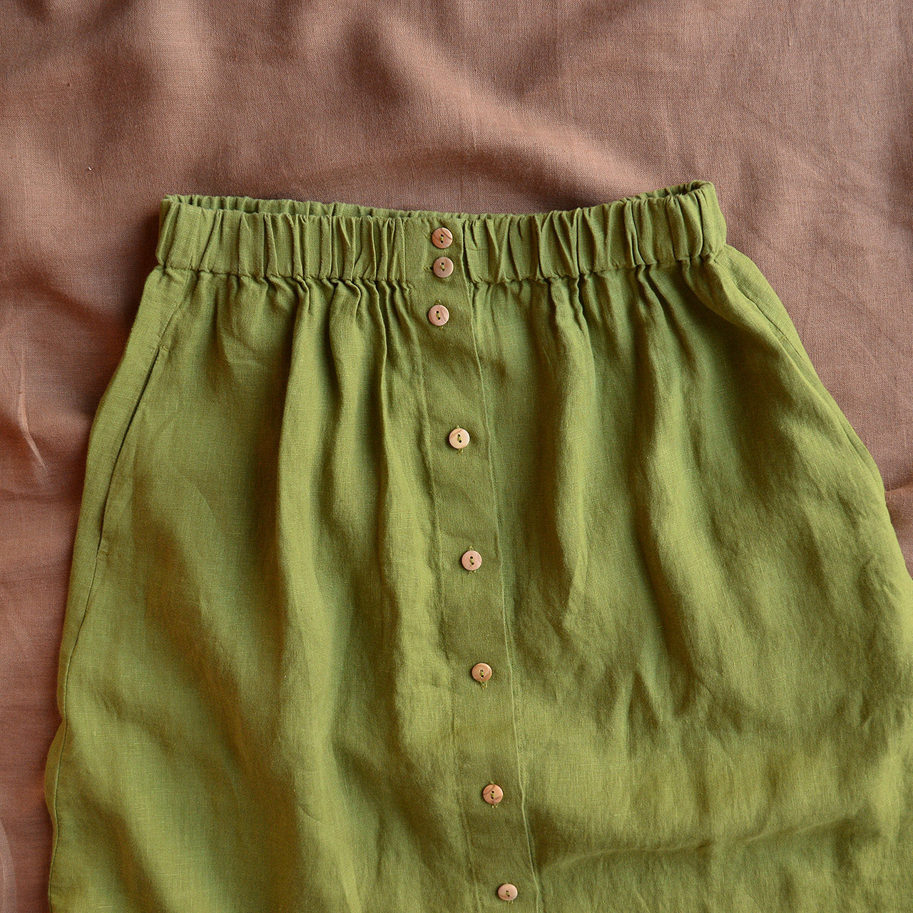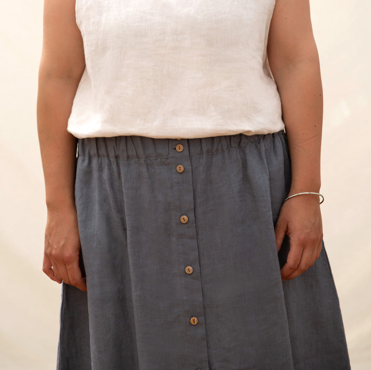 A real classic for all year round: Matona's 100% linen Midi Skirt. Super easy to combine with a linen or wool/silk blend t-shirt on warm days or pair with cosy wool knits and thermals in cooler weather. A versatile and truly comfortable skirt with an elastic waistband, side seam pockets and lovely wooden button front.
