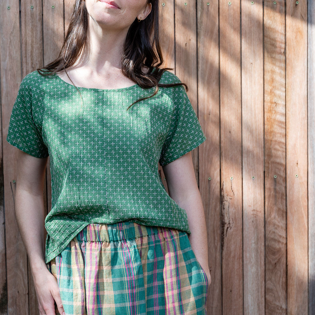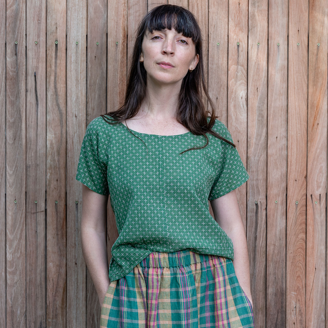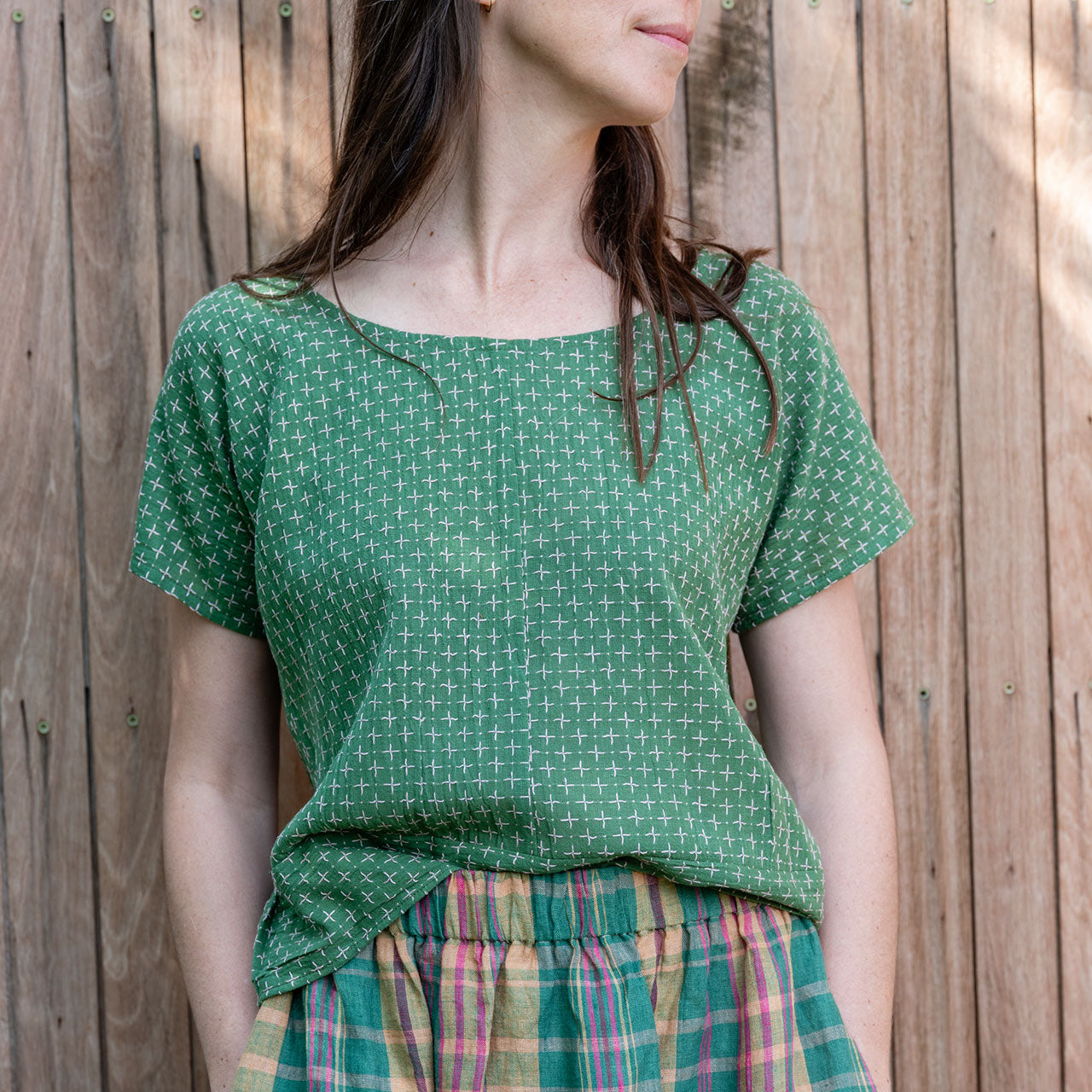 This comfortable, flattering and boxy Women's top was originally designed to use up cloth offcuts and ensure very little fabric waste. Features side pleats, a selvedge hem and box pleats in the back panel. This cool and breezy cotton is perfect for summer.