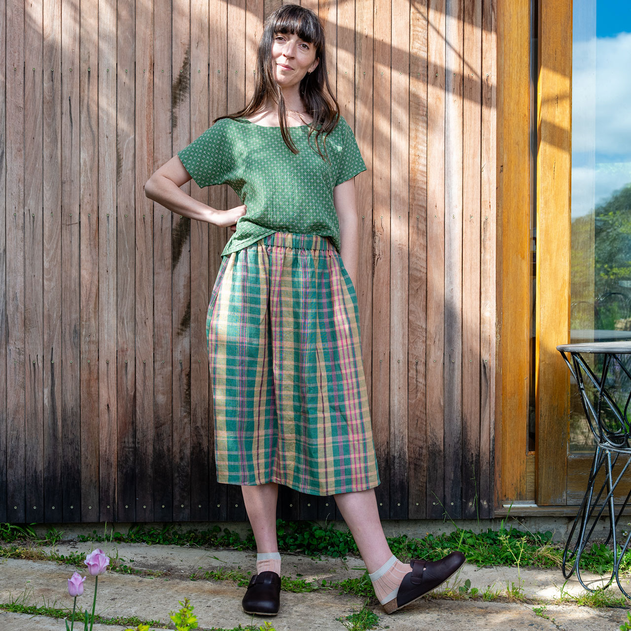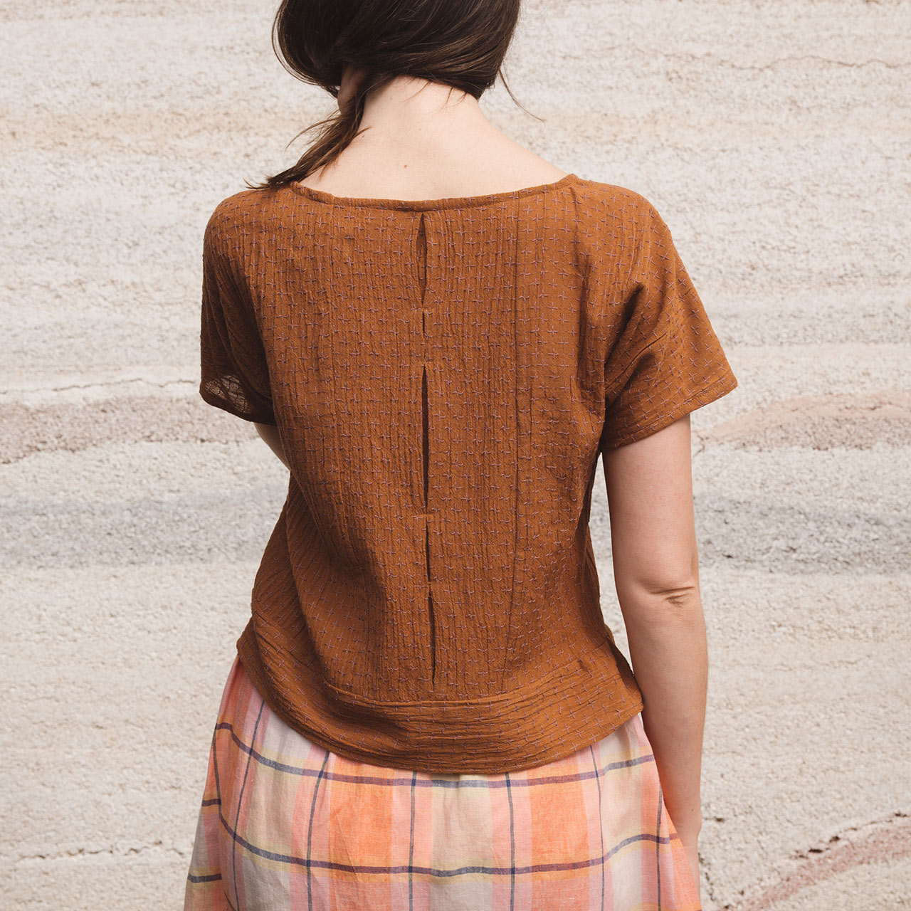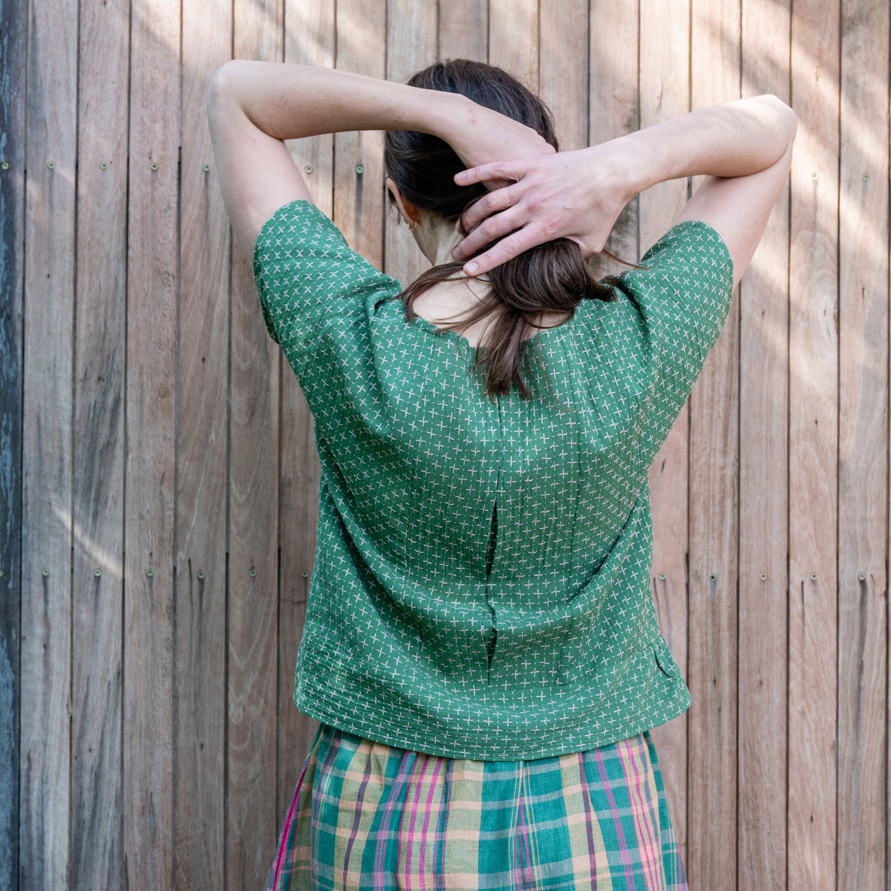This comfortable, flattering and boxy Women's top was originally designed to use up cloth offcuts and ensure very little fabric waste. Features side pleats, a selvedge hem and box pleats in the back panel. This cool and breezy cotton is perfect for summer.