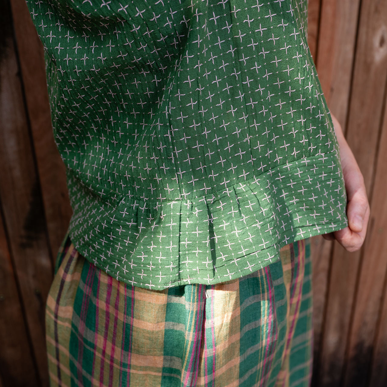 New! Umiform's Pieces Top in a beautiful in sweet pea green Indian cotton muslin with a gauzy crinkled texture and cross stitch detailing in soft pink. Modelled in last year's Sage Pink Check - photos of new season's colours coming soon.
