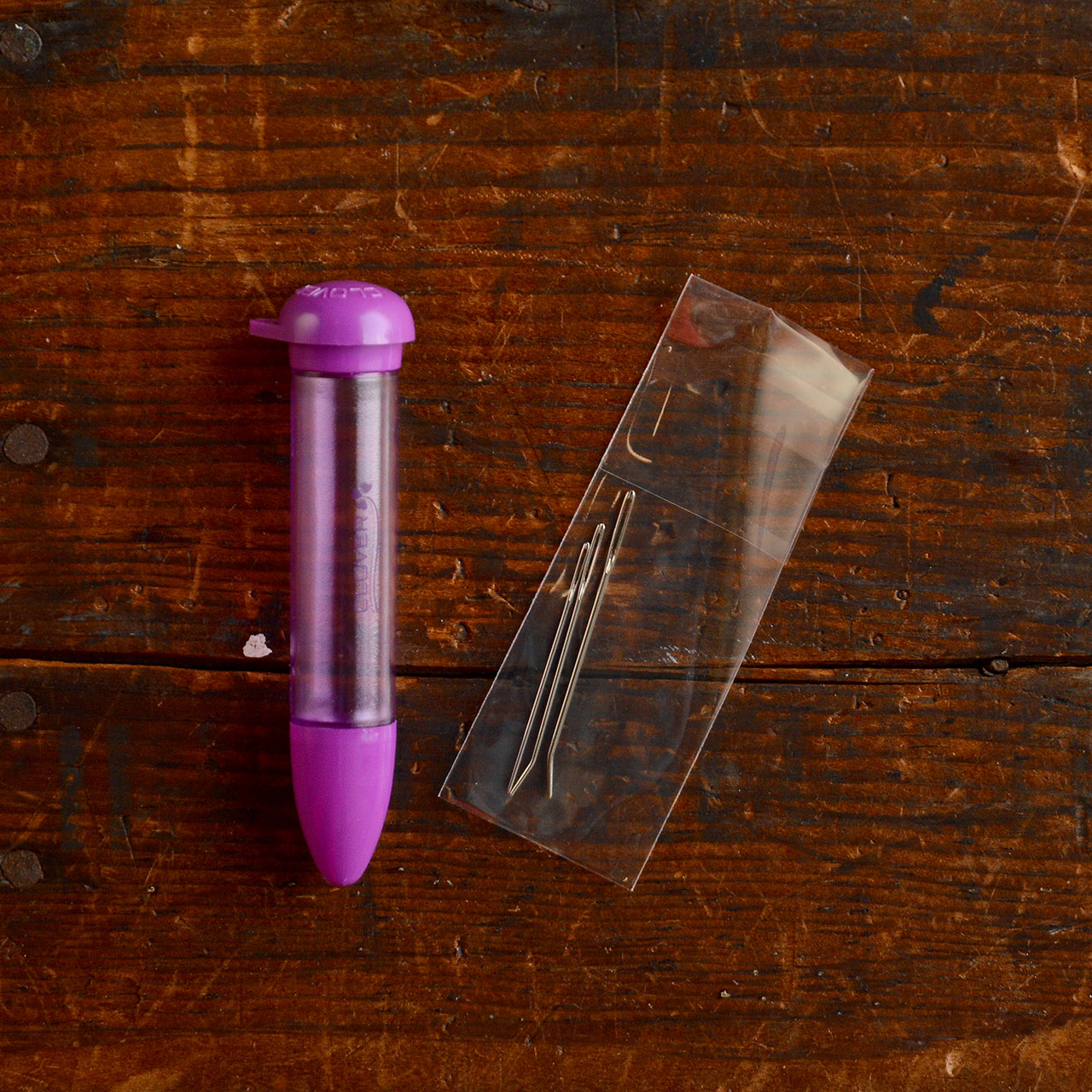 Green Clover Lace Darning Needles Set in a convenient carrying case with a screw on cap stores needles neatly. This set of 3 fine darning needles contains two with bent tips which is helpful when darning and weaving. Darning needles are essential for hand-knitting, darning and grafting.