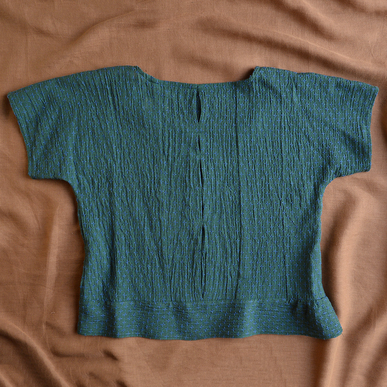 New! Umiform's Pieces Top in a beautiful dark turquoise Indian cotton muslin with a gauzy crinkled texture and cross stitch detailing in mid blue. Modelled in last year's Sage Pink Check - photos of new season's colours coming soon.