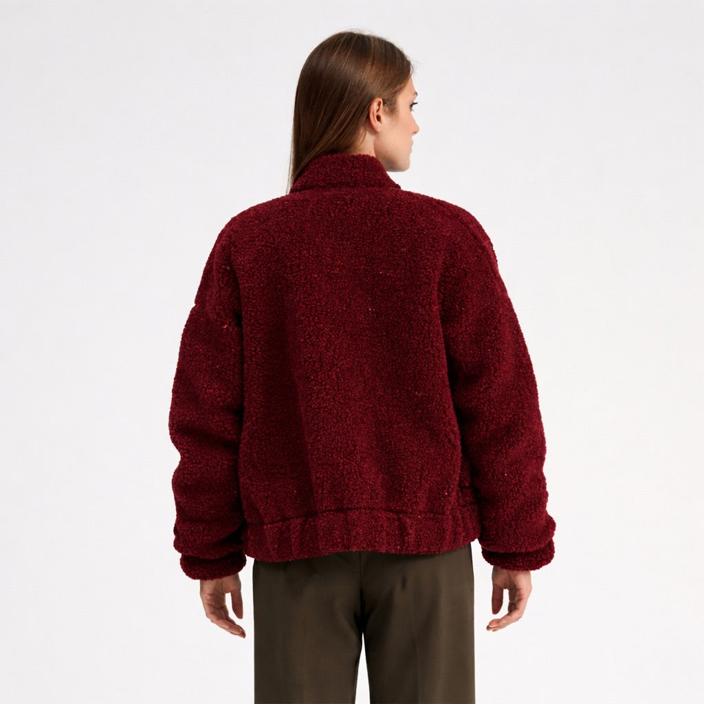 Luxurious plush wool bomber style jacket for women in 100% wool. Soft, squishy and super warm, this gorgeous cosy hip-length jacket is perfect for winter layering. Fastened with a metal zipper, and finished with wool ribbing at the cuffs and at the hip line and a stand-up collar.