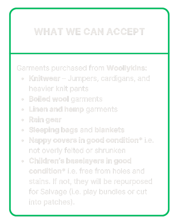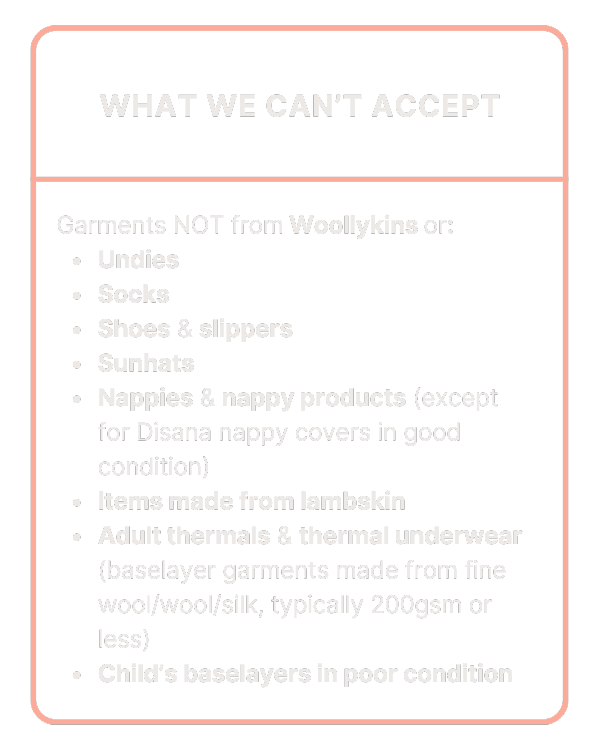 Woollykins customers can now return pre-Loved Woollykins garments for store credit. Your garments will be renewed by us and go on to keep another family healthy and warm.