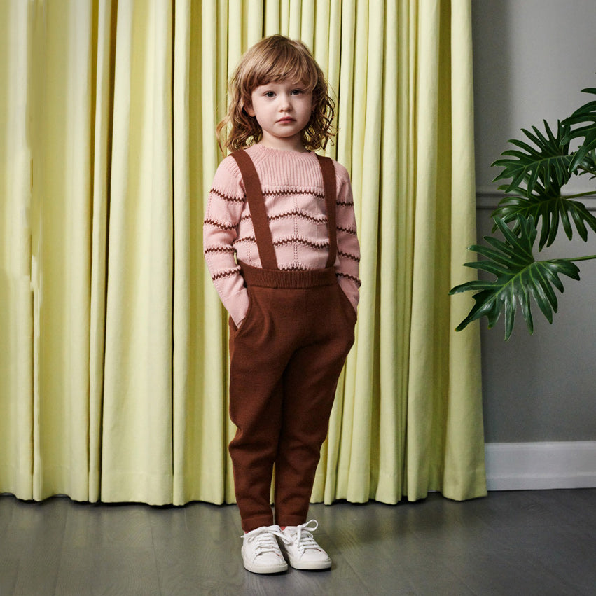 Knitted Merino kids trousers with pockets and detachable braces. Lovely relaxed cut and non-restrictive classic kids design. Super fine and soft merino wool, suitable for even the most sensitive skin. Braces fully removable so that they can also be worn as as regular pants.